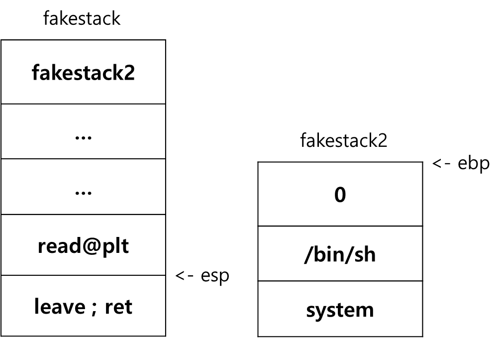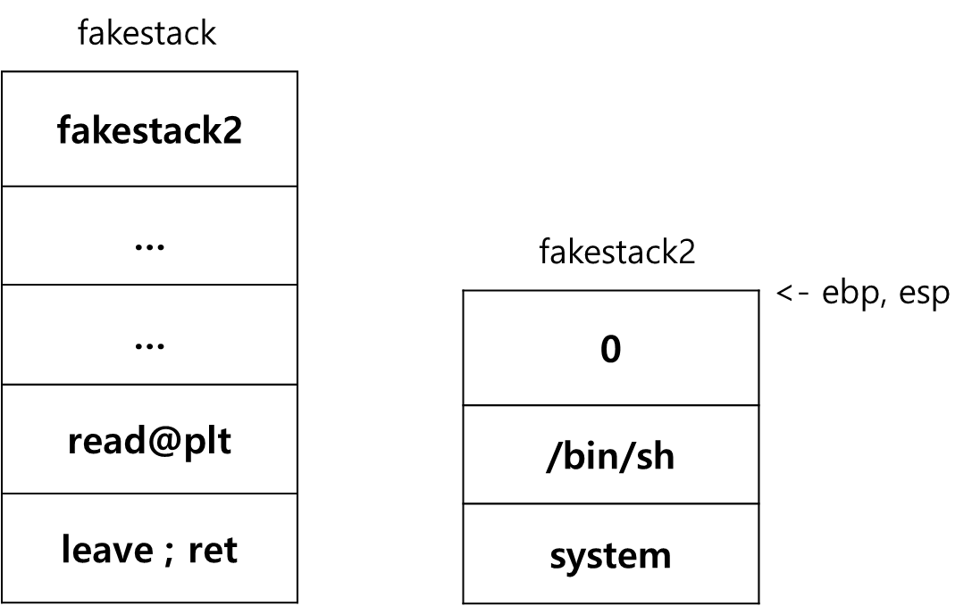 pop ebp 명령을 수행하면 fakestack 에 넣어둔 fakestack2 로 이동하게 된다