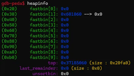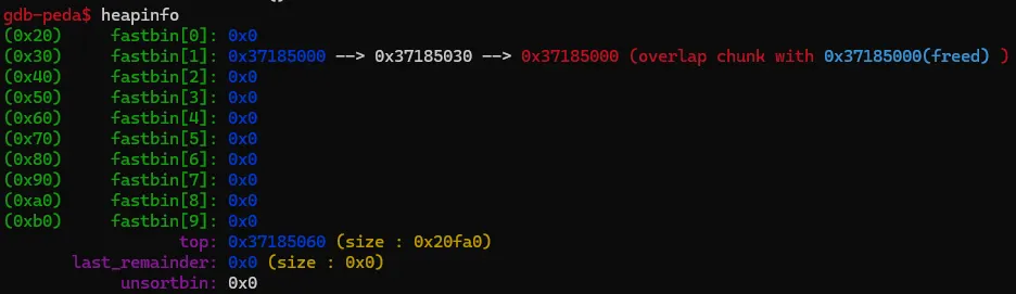 0x37185000 --> 0x37185030 --> 0x37185000로 duble free가 발생한 것을 볼 수 있다.