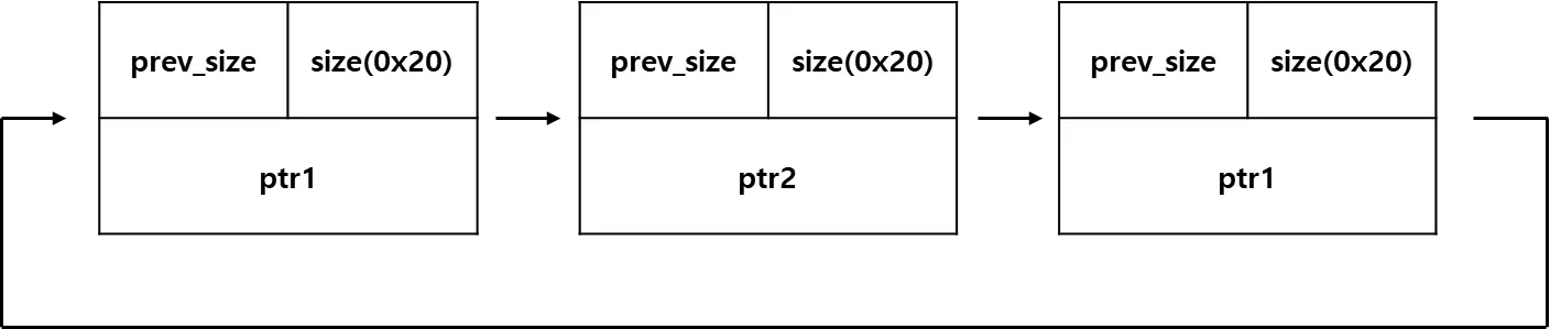 fastbin 리스트는 ptr1 → ptr2 → ptr1 → … 의 순환 구조를 가진다.
