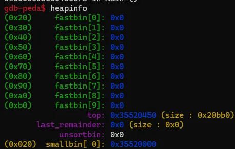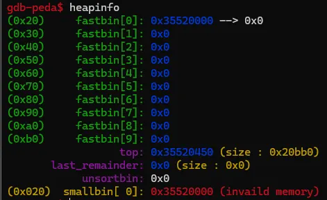 double free가 발생하여 smallbin의 청크에는 invalid memory가 뜬 것을 알 수 있다.