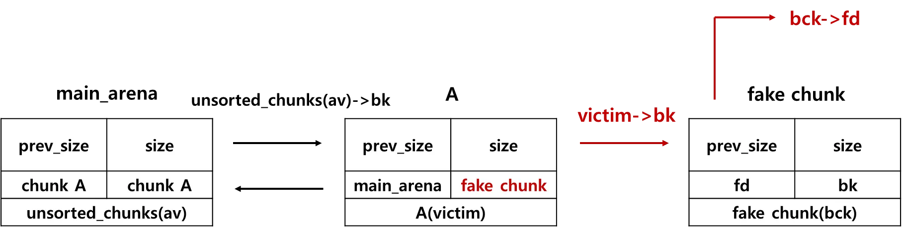 fake chunk의 fd에 main arena 주소 값을 쓰고 싶다면 chunk A의 bk 위치에 [원하는 주소 값 - 16]을 쓰면 된다.