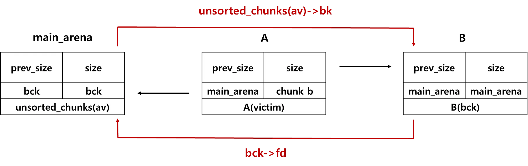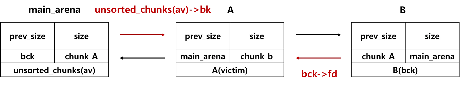 chunk A의 bk값은 main_arena를 가리켜야 하지만 bk 값이 조작된 상태이다.