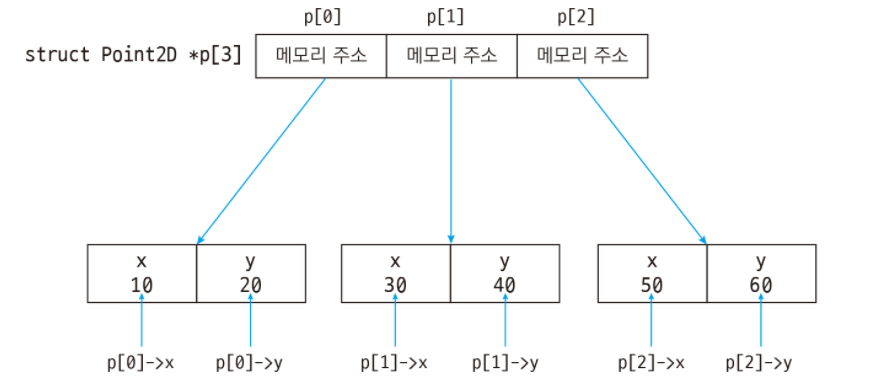 p[i] = malloc(sizeof(struct Point2D)); // 각 요소에 구조체 크기만큼 메모리 할당