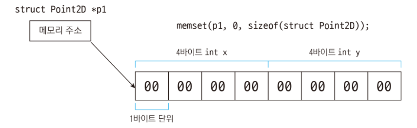 memset(&p1, 0, sizeof(struct Point2D)); // p1을 구조체 크기만큼 0으로 설정
